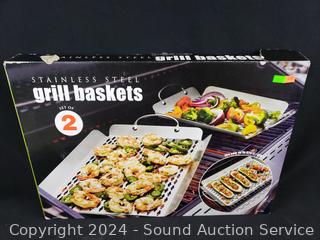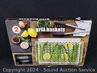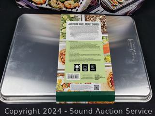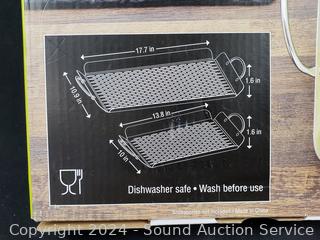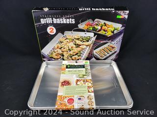 18" x 13" baking sheets, 10" x 13.8" & 10.9" x 17.7" grilling baskets. All appear unused, baking sheets have some minor dings.