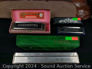 M.Hohner Echo #C, Hot Metal #C, Koch Chromatic #C harmonicas, 2 metal music stands, Seiko Tolv quartz music tuner.