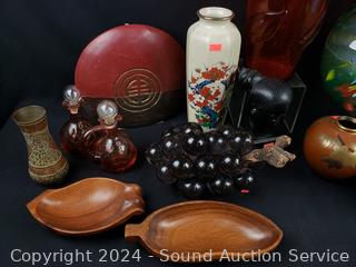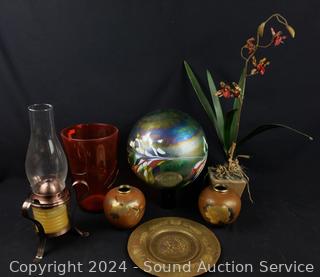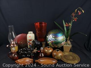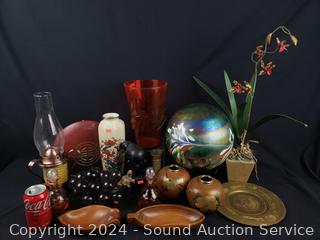 Grape bushel, glass gazing sphere, amberina art glass vase, oil lamp, porcelain vase, cruets, bronze cruet & more Refer to photos for more details.