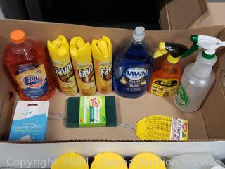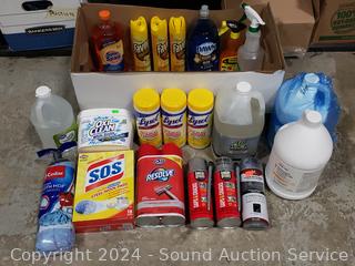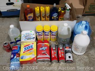 Most or all appear full or mostly full. Disinfecting wipes, Oxi Clean, furniture polish, SOS steel wheel pads, Resolve carpet cleaner, Dawn dish soap, Goo Gone, Scotch Bright scour pads, Hydrogen Peroxide, Airwick liquid air freshener. Refer to photos for more details.