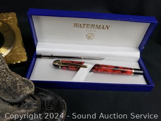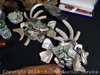 Avon bottles, coping saw, seashell fish, mechanical Seth Thomas clock, musical cottage trinket box, Inukshuk stone man figure, miniature tea set, glass insulator, tin & more. Refer to photos for more details.