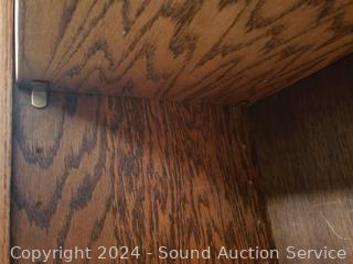 Appears to be solid wood construction. Some minor scuffs, wear to finish. 72" H x 41" W x 12.5" D.