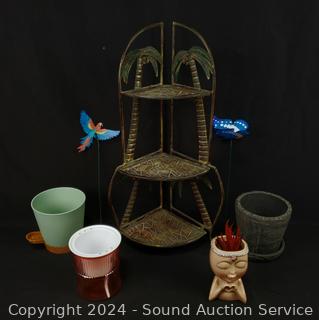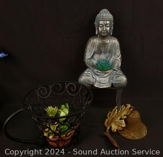 Pots, small tiered shelf 20" H x 7" x 7", composite Buddha statuary, faux plants & more. Refer to photos for more details.