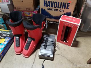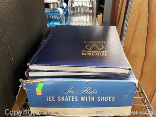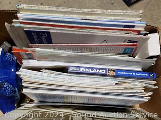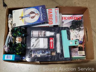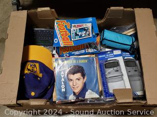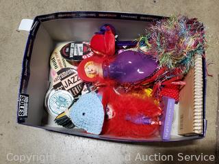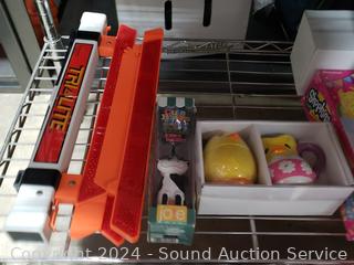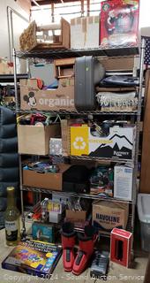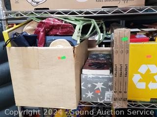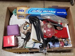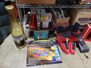 Lighted wood Nativity scene, Corona coin bank bottle, suitcase, emergency triangle, ski boots, maps, 1st state quarters collectors map, 14x20x1" furnace filters, animated "Dancing Clause Couple", throw blanket, tons of various other household goods. Refer to photos for more details. Cart NOT included.