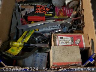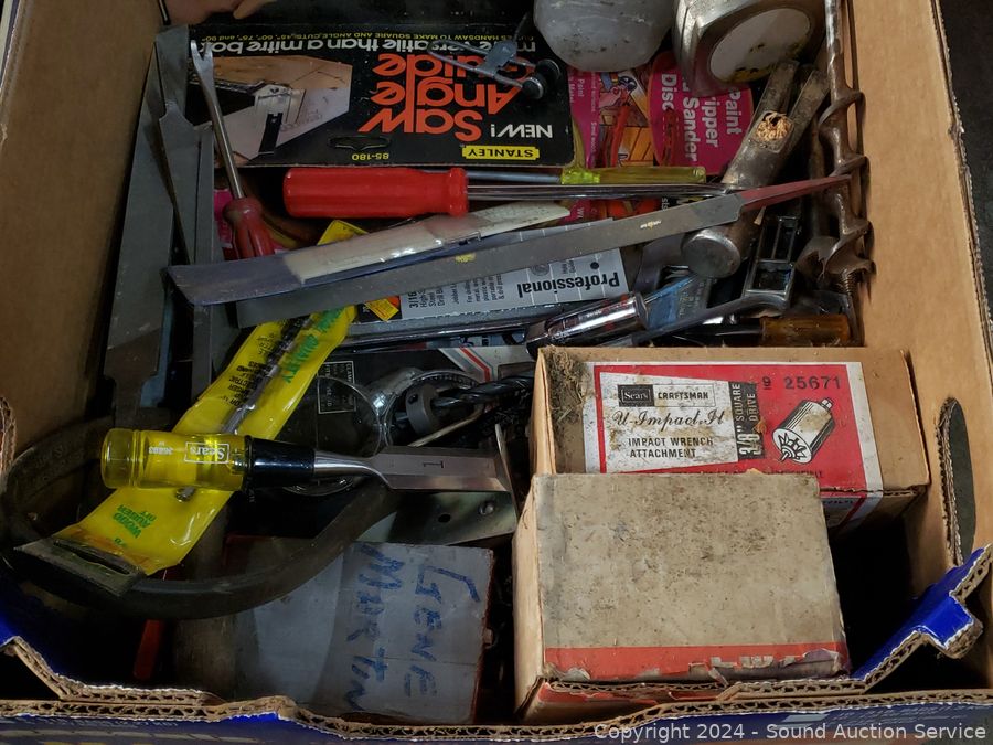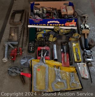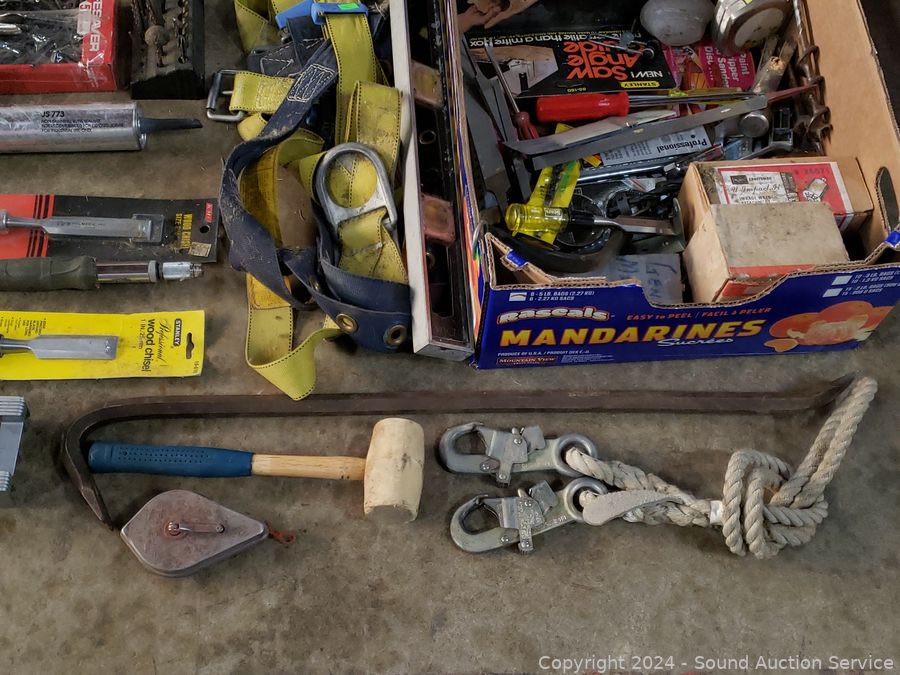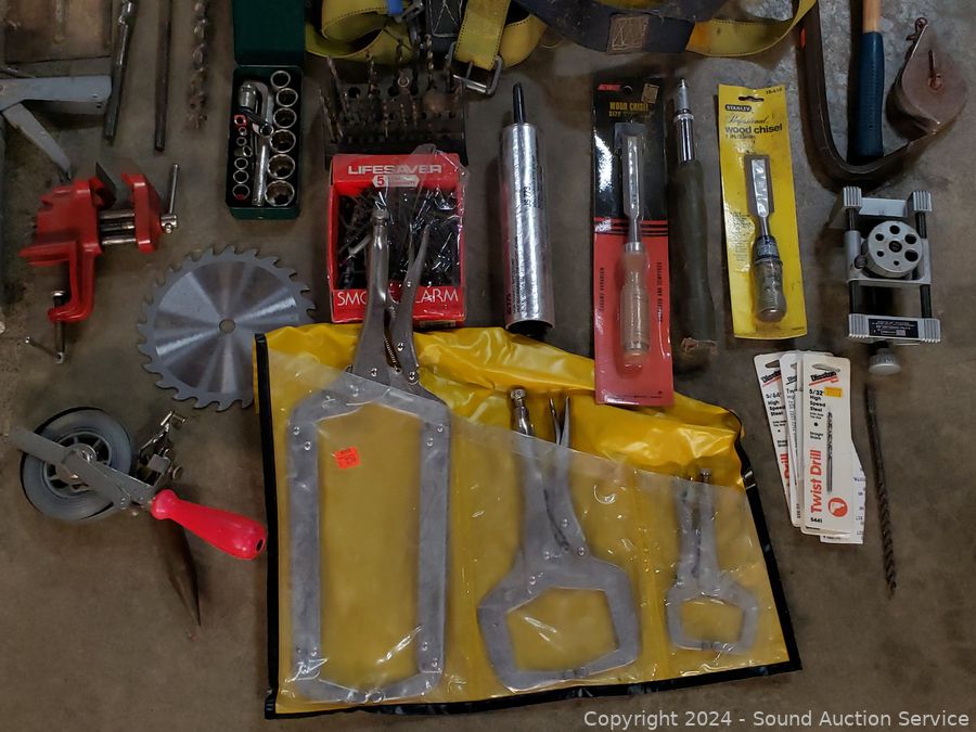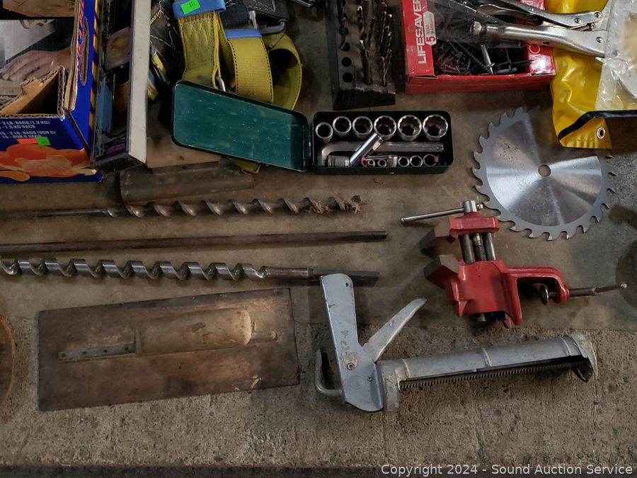 Safety harness, dated 04/20/92, label is worn. Crowbar, 8" C-clamp, vise, lanyard, circular saw blade, drill/auger bits & more. Refer to photos for more details.