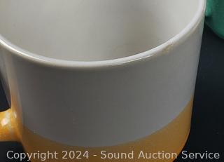 11.5" x 8" & 15" x 11.25". Yellow mug has a chip on lip.
