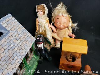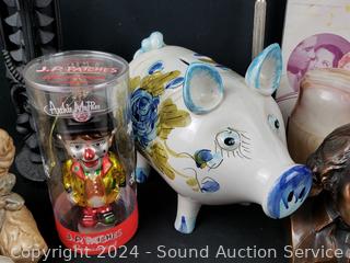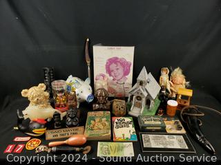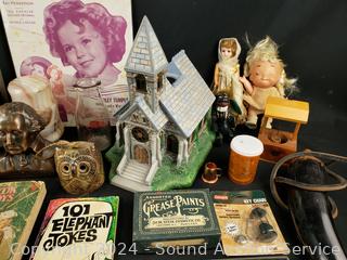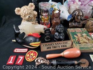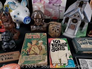 Onyx stone jar, hand painted porcelain piggy bank, stone lion sculpture, resin Buddha figure, powder horn, 1940's Boy Scouts hand book, porcelain house & more. Refer to photos for more details.