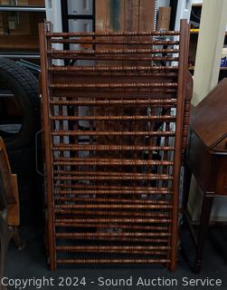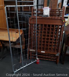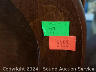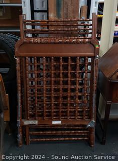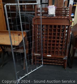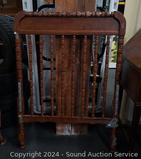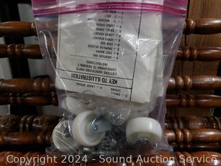 Unassembled, unknown completeness. All major pieces appear to be present, comes with bag of hardware. Some wear to the finish.