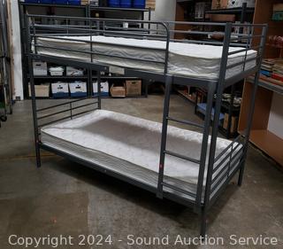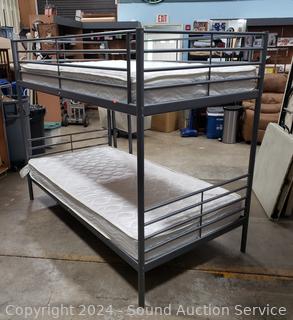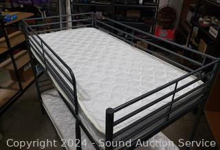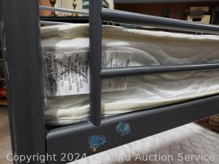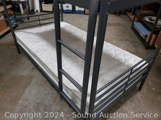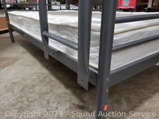 63" H x 76" x 40". Missing screws for bottom of the ladder. Has plywood under mattress.