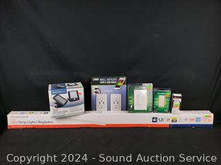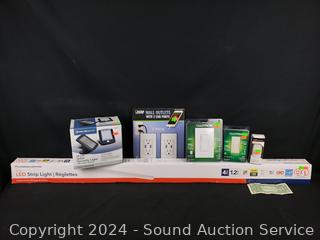 Lot #0203: Light Switches, USB Wall Outlets, Solar Security Light & 4ft LED Strip Light