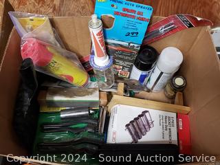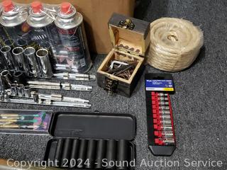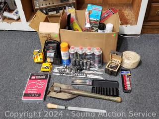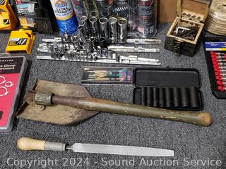 Assorted sockets, trench shovel, Plasplugs compact sharpener, hose clamp assortment, socket rails, 4pk of butane, metal dust pan & more. Refer to photos for more details.