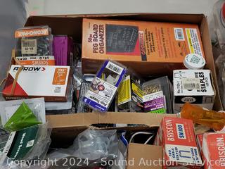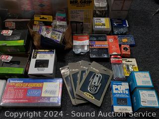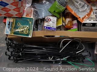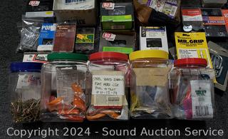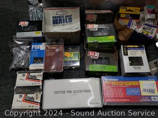 Nails, washers, screws, brads, hitch clip assortments. Refer to photos for more details, contents. Tote with lid included, 11" H x 22.5" x 16".