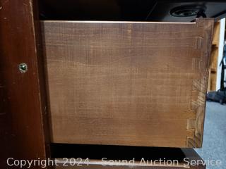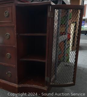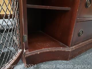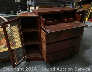2 side cabinets with steel mesh, top drawer front folds down for a desktop surface. Solid wood construction, dovetail joinery. Various scuffs, scratches in finish. 34" H x 48" W x 15" D.