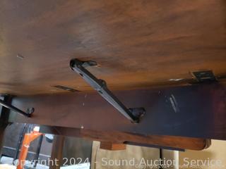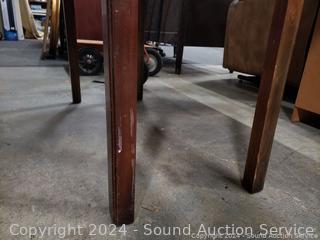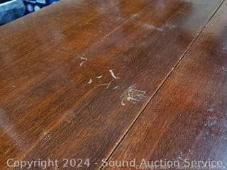 29.5" H x 36" x W x 15" to 41" L. (2) 13" drop leaves, (3) insert leaves. Various scuffs, wear to finish.