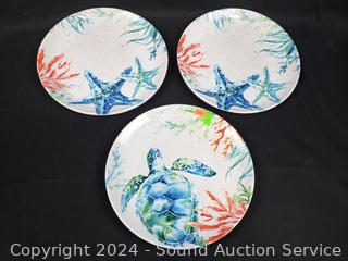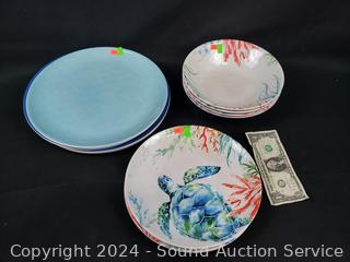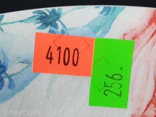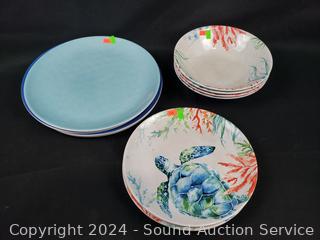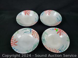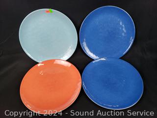 Have been used, large plates have some scuffs, scratches. 4 bowls, 3 lunch plates, 4 dinner plates.