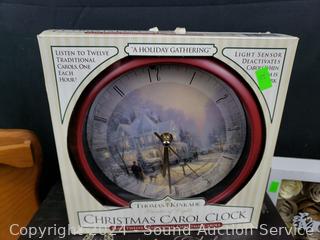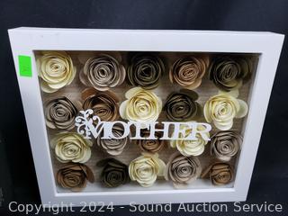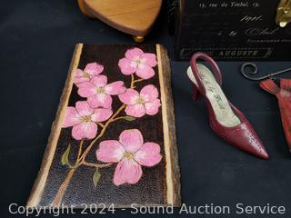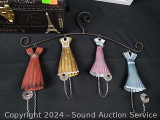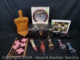 Eiffel Tower decorative box 7" x 12" x 8", Christmas carol clock, "Mother" shadowbox, metal art dress hanger, wood slab painting, small shelf. Refer to photos for more details.