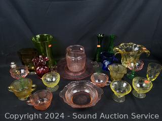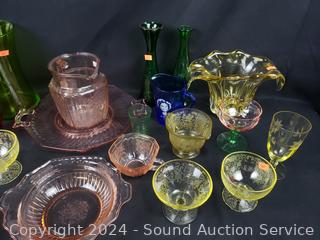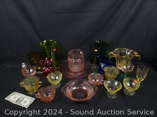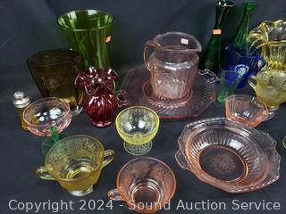 Lot #0086: Tote of Assorted Colorful Depression & Other Glassware