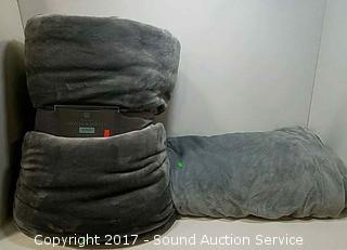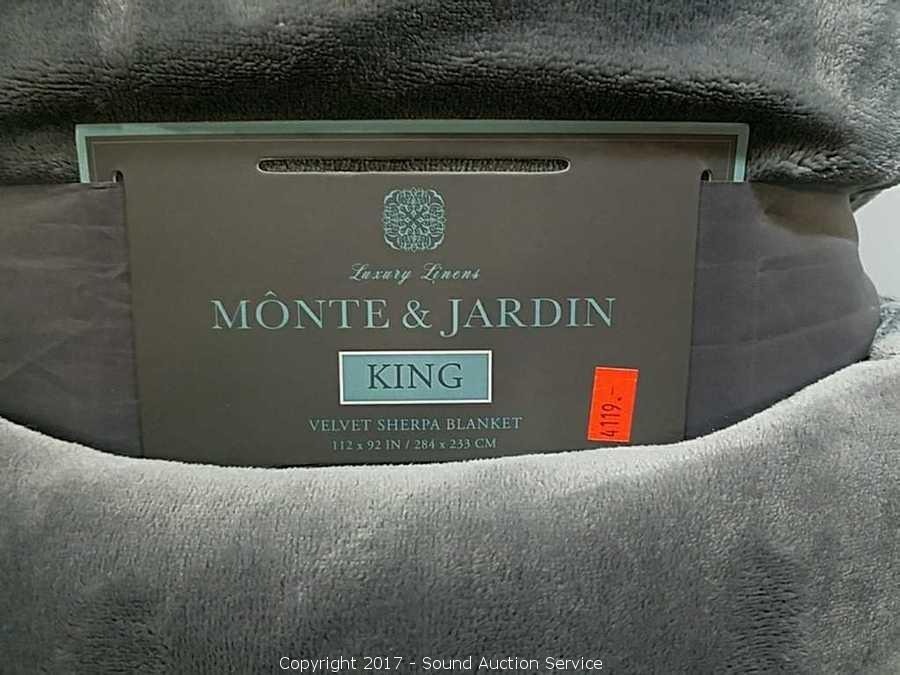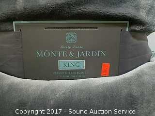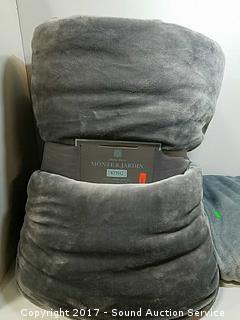 One is approx. 88" x 98". Other is Monte & Jardin King sherpa blanket. Refer to photos for more information.