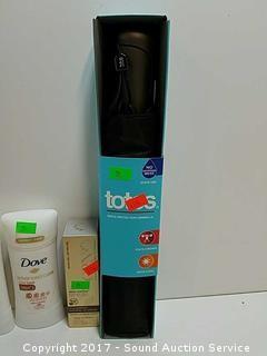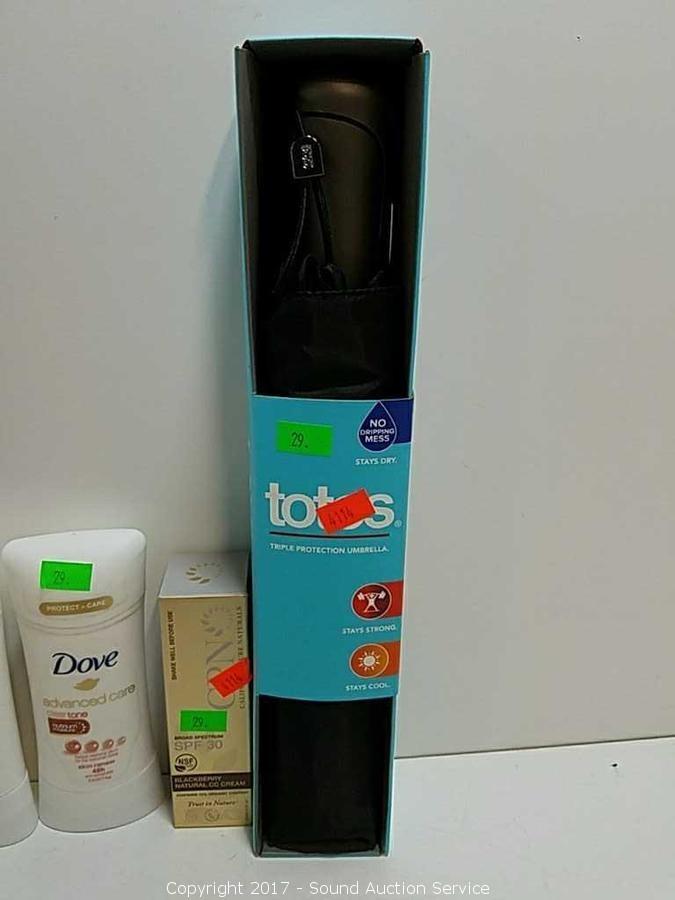 Includes: Gloves by Head, conductive, size medium and size XS. Umbrella by Totes. Sunscreen by California Pure Naturals. All are new.