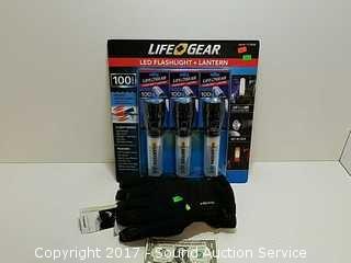 Flashlights by Life Gear, 100 lumens. Gloves are size medium, feature sensytech technology. Both are new.