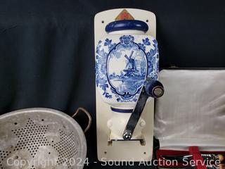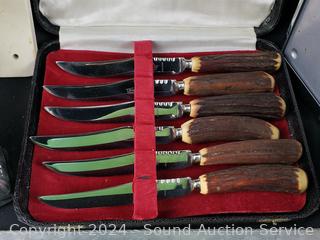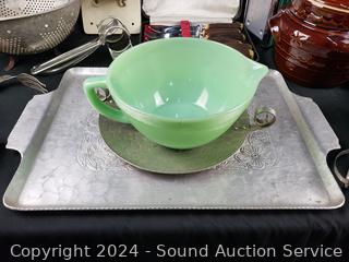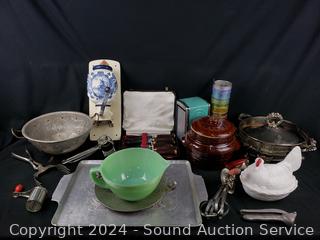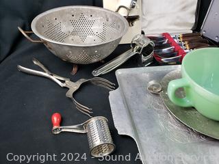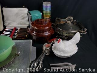 Napkin dispenser, 6pc Manor House Sheffield stag handle steak knife set, Marcrest bean pot, aluminum platter, colander & more. Refer to photos for more details.