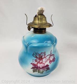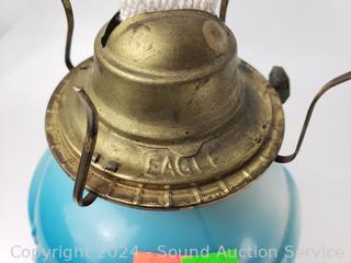 P&A Mfg. oil lamp, no chimney. Rooster lamp appears to be functioning as intended. Shade has a dirty spot & cut.