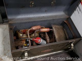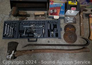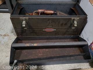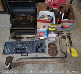 18" steel toolbox, hammer, crowbar, splitting axe, level, nails, braces, hand tools, vise & more. Refer to photos for more details.