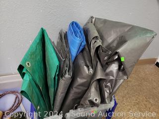 Refer to photos for more details. Tarps are various sizes, have been cut.