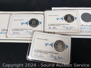 (3) 1974, 1976 & 1977 Franklin Mint Solid Sterling Silver Medals, Presidential Mini Mint Collectors Set, Official 1976 Bicentennial Commemorative Medal. ATTN: We are not coin or currency experts or graders, please use your own judgement when bidding.
