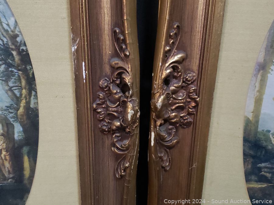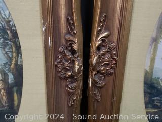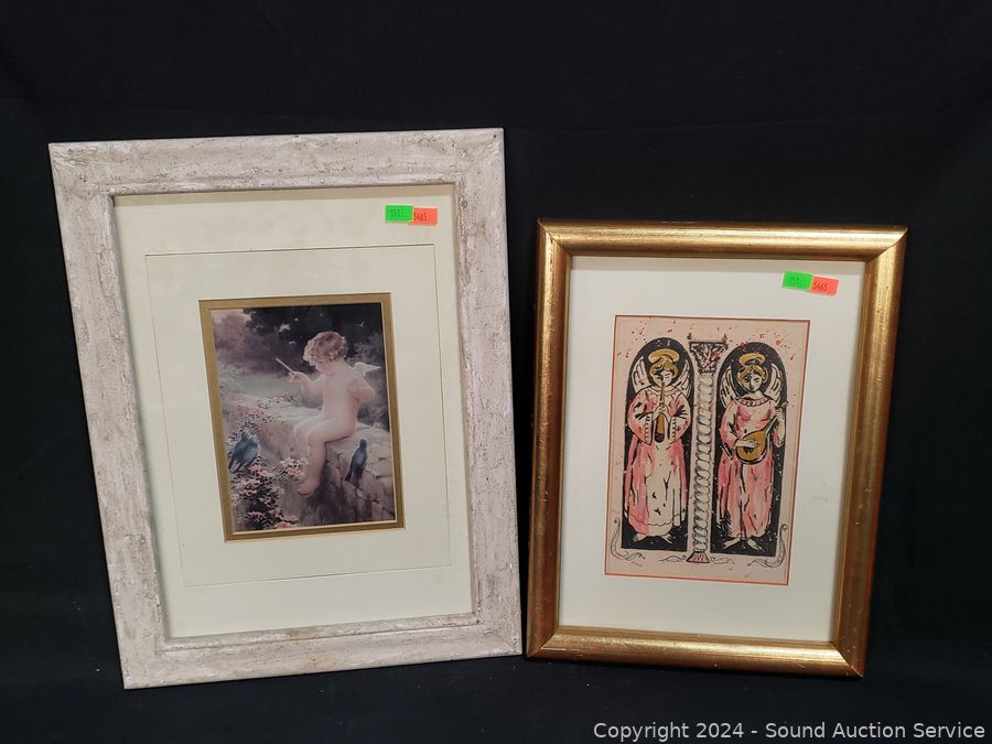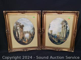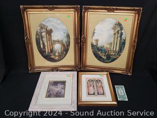 2pc "Roma Ruins" w/gold gilt frames 21" x 17". "Bird Symphany" angel print 16" x 12". Angel colored rubbing? 10" x 14".