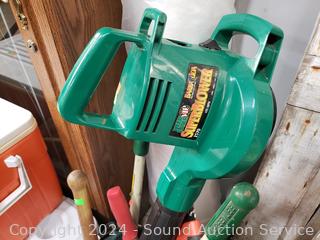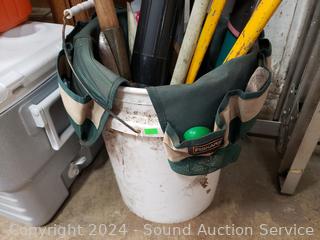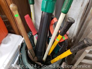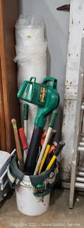 Lot #0050: 5-Gal Bucket w/Lawn & Garden Tools, Leaf Blower & Roll of Plastic