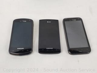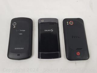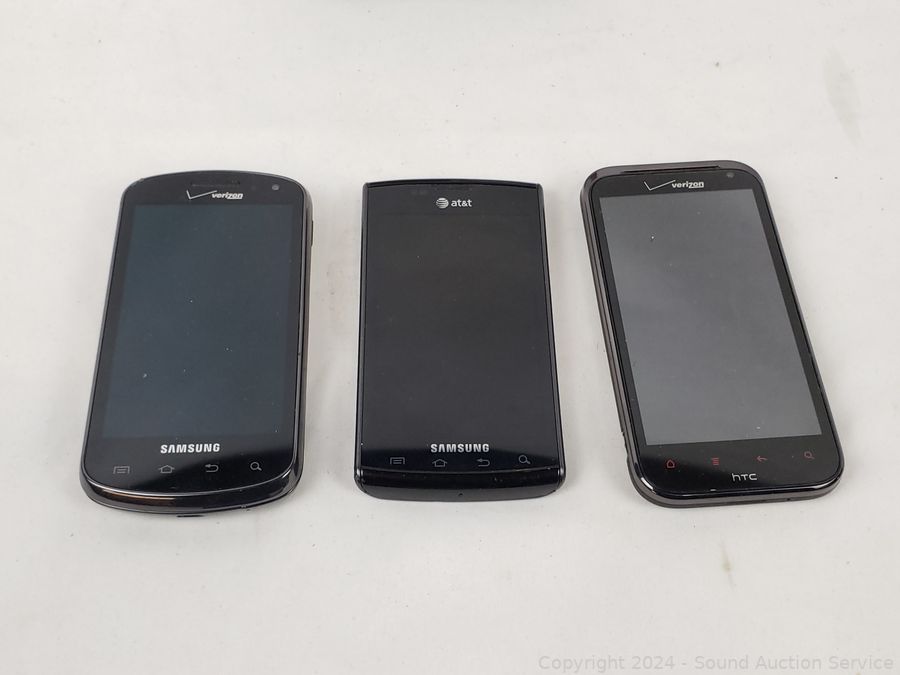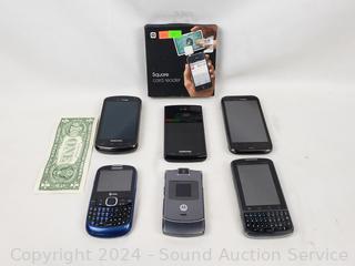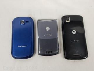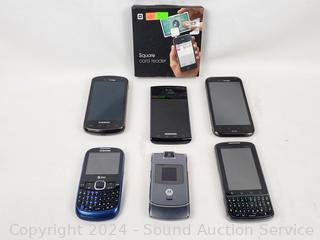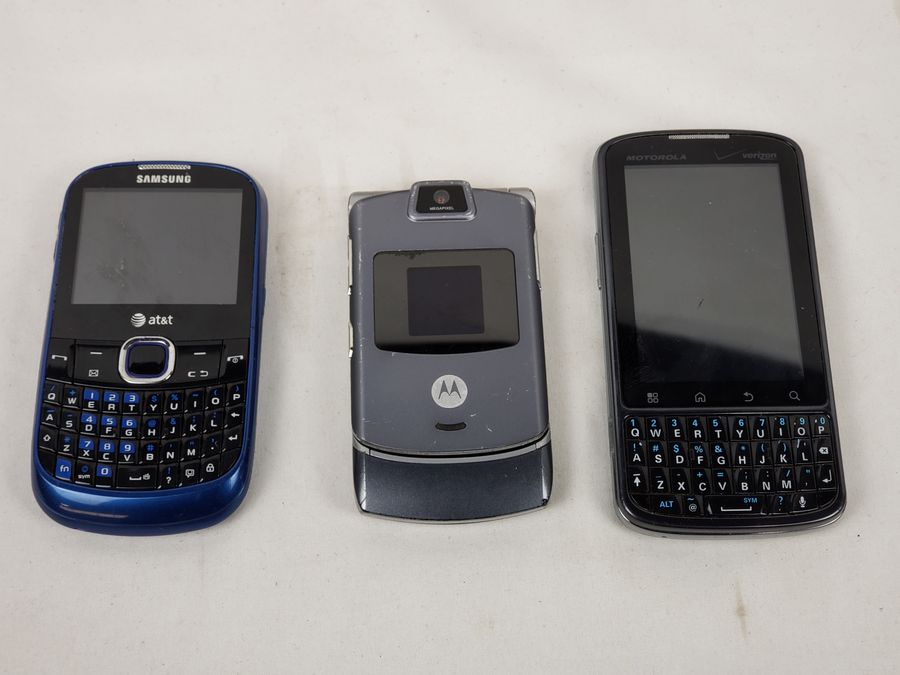 Signs of wear, damage from use. 3 untested (Samsung Verizon, HTC Verizon, Motorola Flip), 3 have power (Samsung ATT, Motorola Verizon, Blue Samsung). Refer to photos for more details.