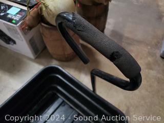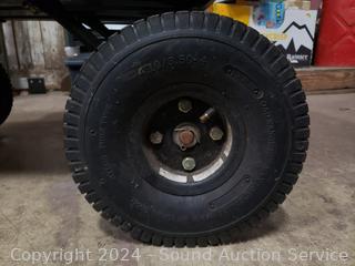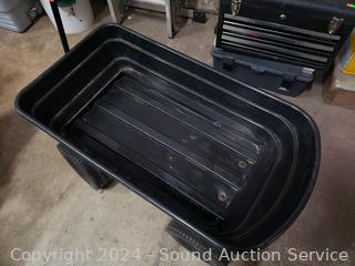 8" D x 20" x 36" dump bin. Signs of wear from use. Inflatable tires, appear to be holding air.