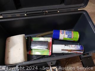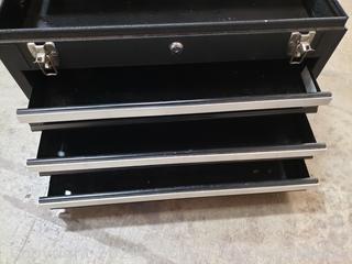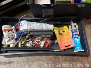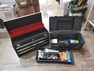 Black steel toolbox is empty, locking with keys, in good condition. Other comes with various tools, hardware, refer to photos for lot contents.