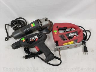 Lot #0112: Skil 3/8" Drill, Jig Saw, & 4.5" Angle Grinder