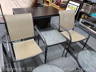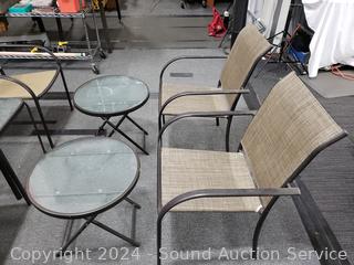 4 chairs, 3 tables (19" H x 18" x 18" & 19' H x 19.75" Dia.), 1 lounger. Some dirty spots, weathering wear.
