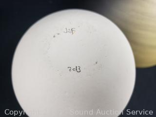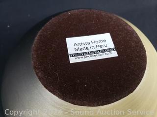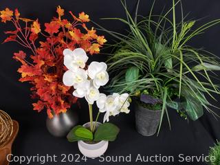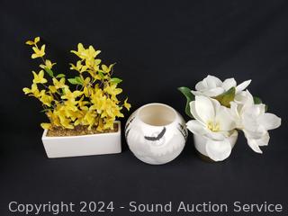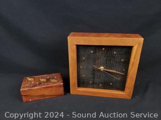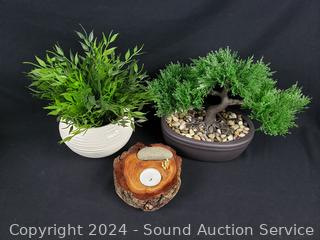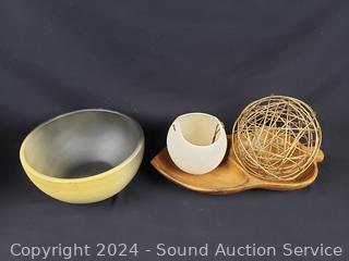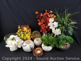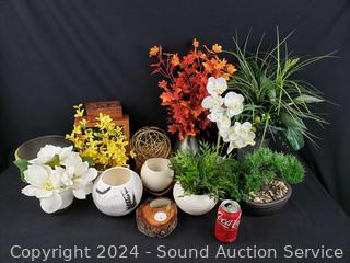 Faux flowers, wood clock (works), bowls, trinket box, candle, sphere. Refer to photos for more details.