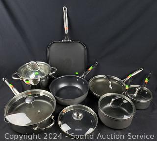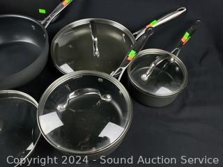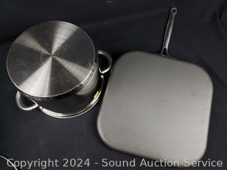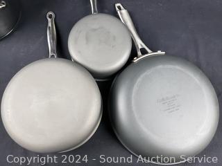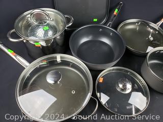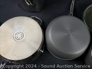 Steamer pot, Cuisinart 10" skillet, 1qt & 2qt saucepans, 3qt multi-purpose pan, Wearever 10" fry pan. 6 lids, steamer inserts, 11.25" flat skillet.