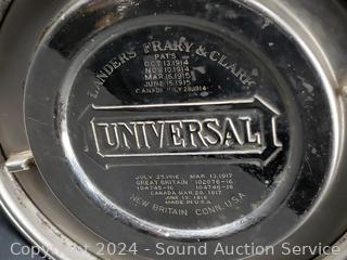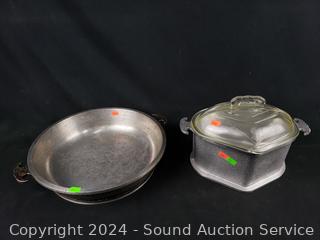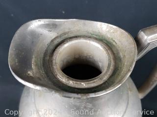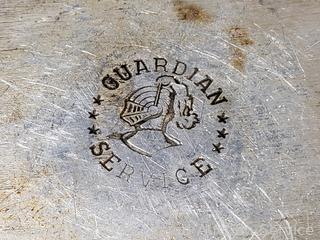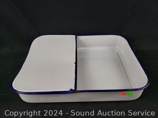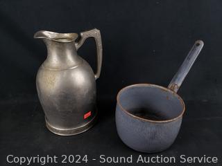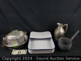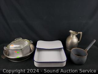 Universal pewter pitcher (glass on the inside is broken), enamelware tray, 2pc Guardian Service ware (1 with lid), 2.75" x 16" x 12".