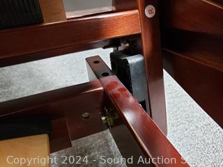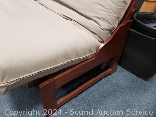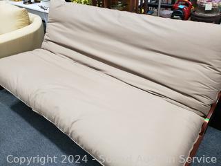 Wood framed. In great condition. Could not get it to go into futon mode, hardware possibly installed on the wrong sides, otherwise don't see any issues. 35" H x 75" L, 52" x 75" futon.