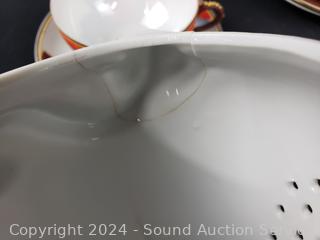 Teapot (has a crack), cream, sugar, 6 cups, whistling sake decanter, 6 saucers, 6 snack plates.