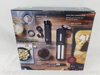 Elec. corkscrew, aerator/pourer, preserver & 2 stoppers, foil cutter, drip collar, charging base. Contents are sealed.