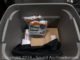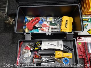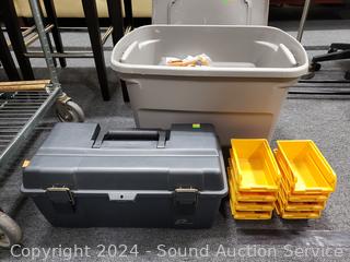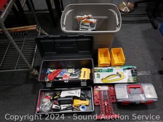 Lot #0038: Tote w/Toolboxes, Sprinkler, Tool Bag, Organizer Bins, Tools, Hardware