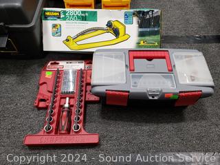 20" & 13" toolboxes with some tools, Nelson sprinkler, small Craftsman tool bag, Craftsman Stubby wrench & socket set, (2) rolls 1-1/4" x 3/16" x 17ft weather seal & more. Refer to photos for more details.