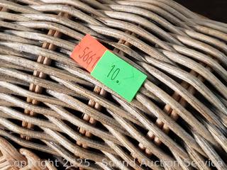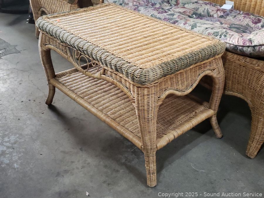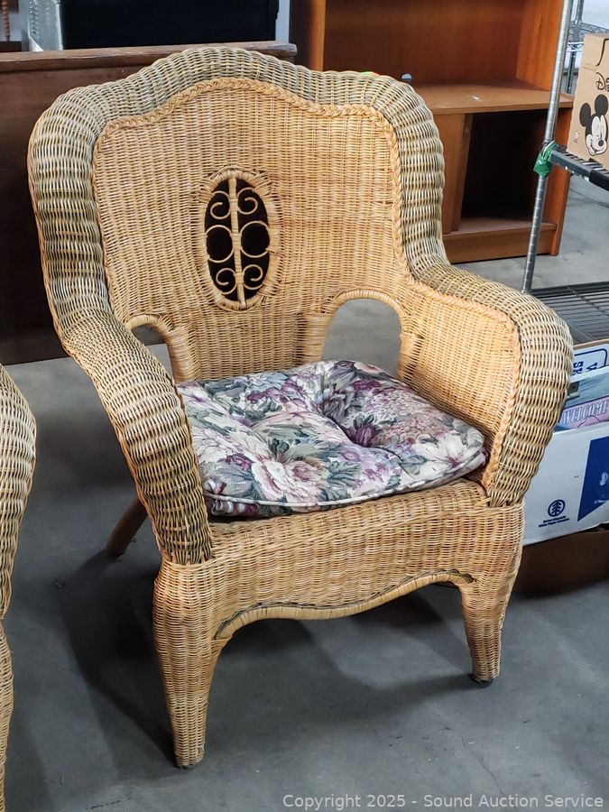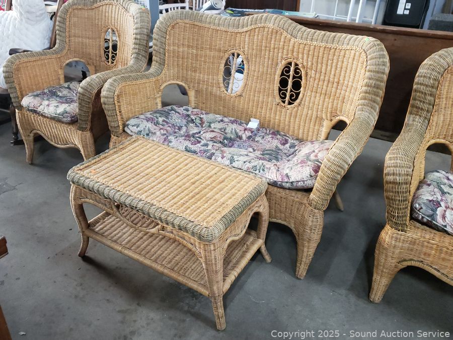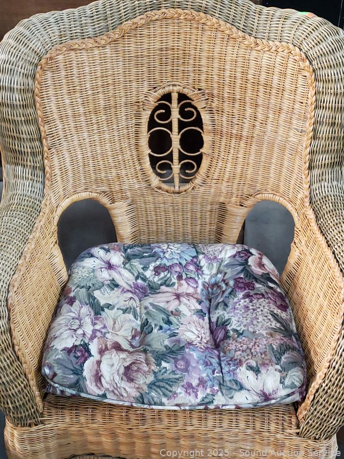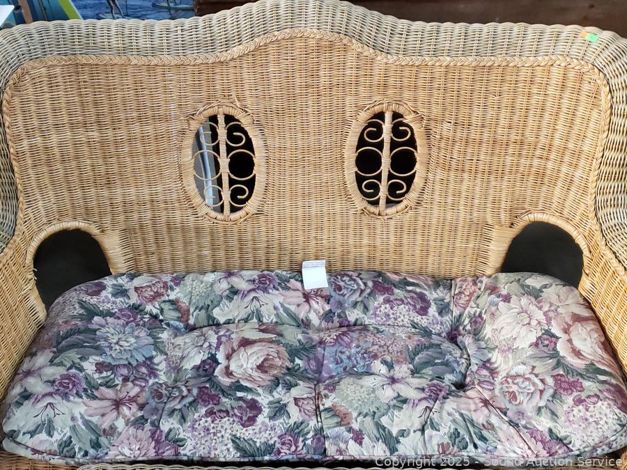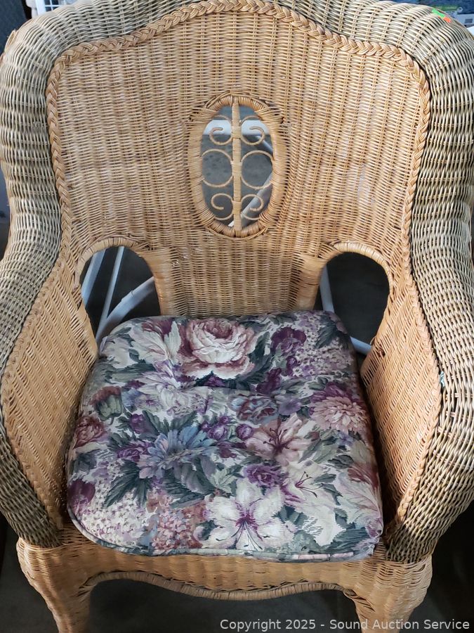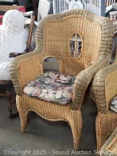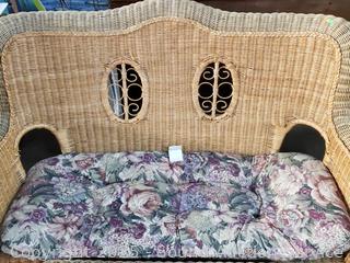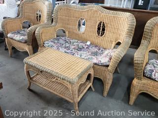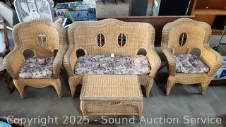 Floral upholstered cushions. Loveseat see some minor cracked wicker pieces. Overall great condition. 18" H x 31" x 17" table, 39" H x 30" W x 16" to to seat chair, 38" H x 52" W x 16" to seat loveseat. Refer to photos for more details.