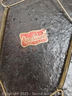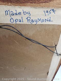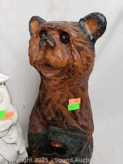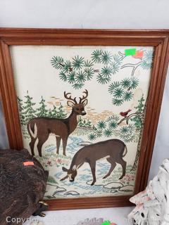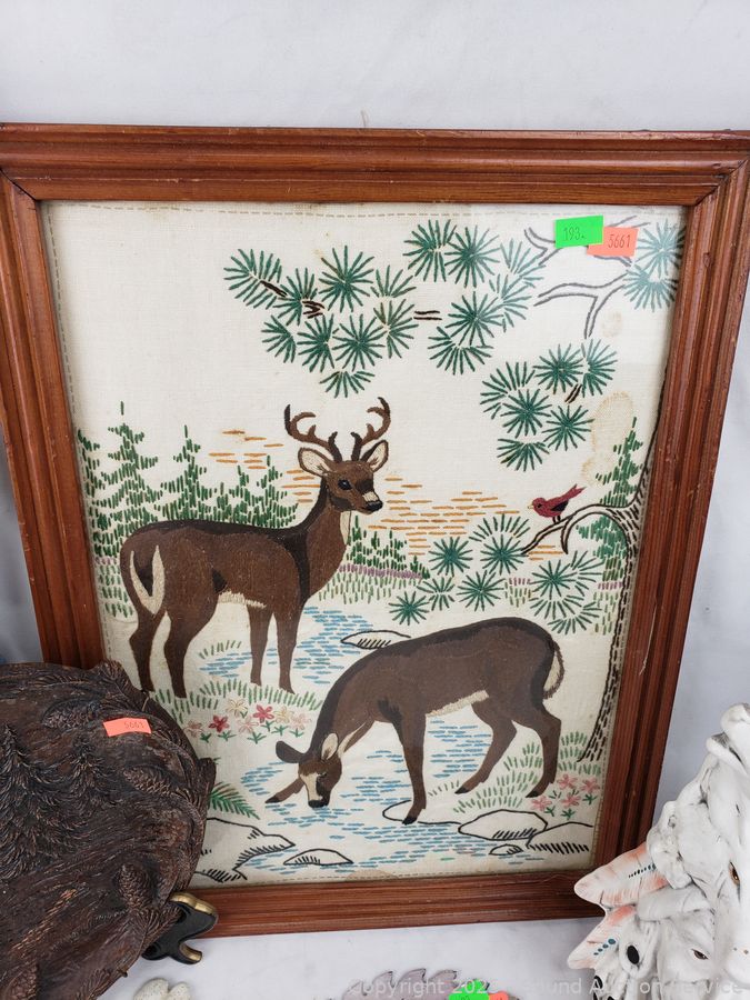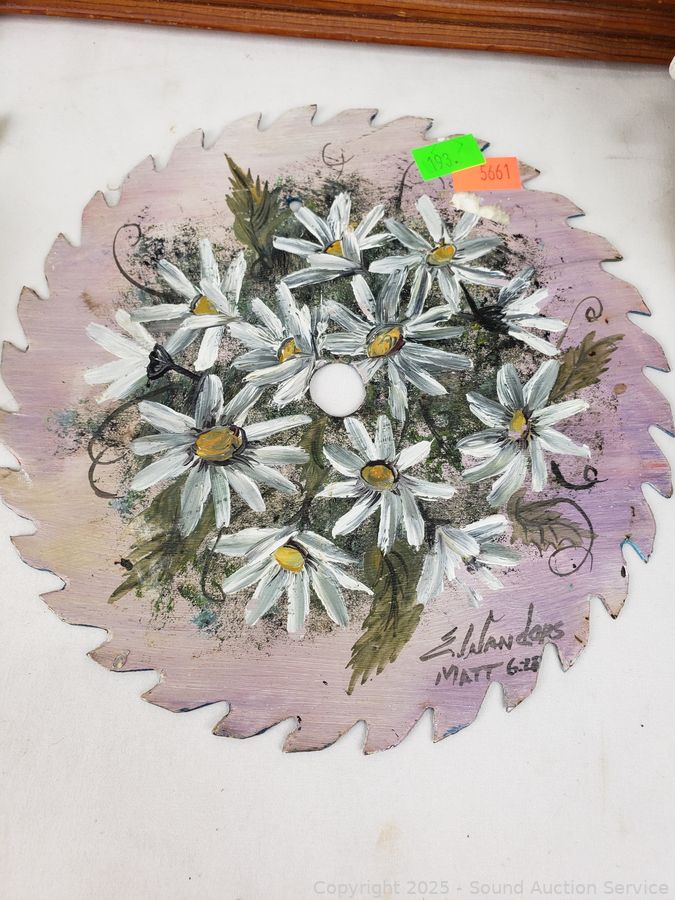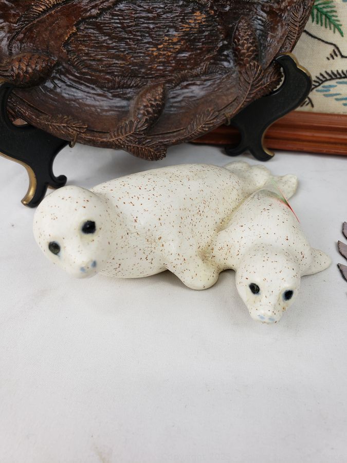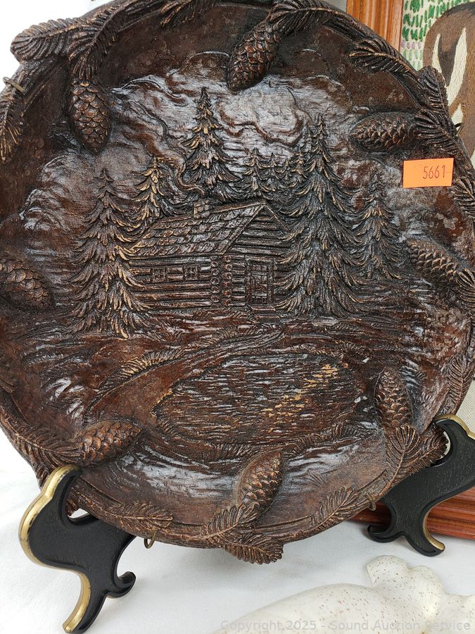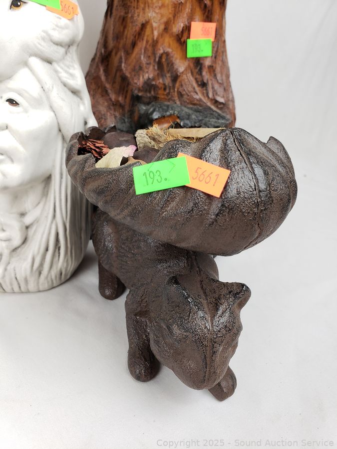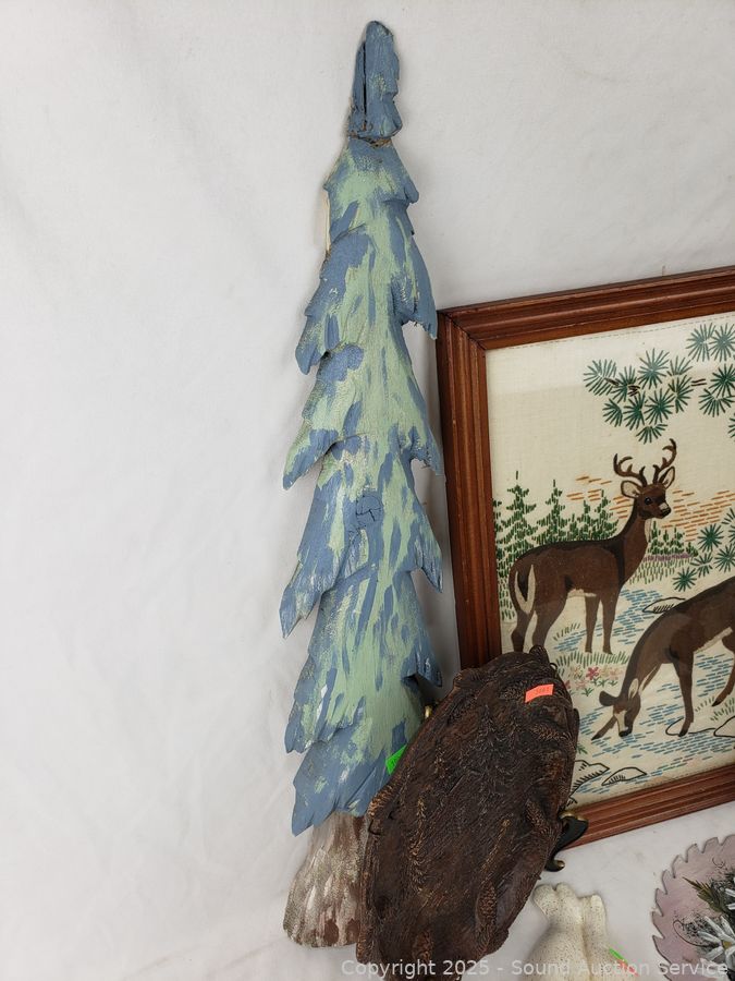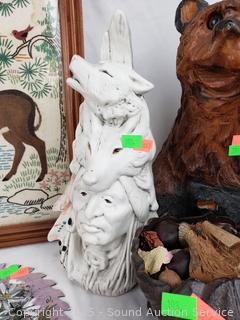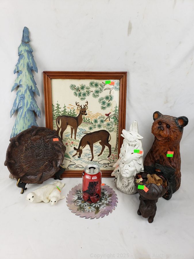 Signed painted circular saw blade, cast iron squirrel nut bowl, carved wood plate, embroidered deer artwork (Signed dated on back, c.1957), pottery chief/wolf sculpture, carved wood bear figure, carved wood tree, pottery seal figure. Refer to photos for more details.
