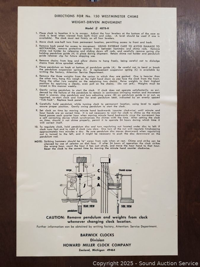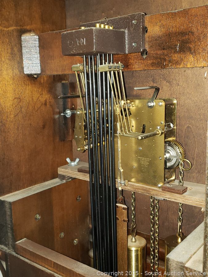 Ran for a minute then stopped, may just not be level. Not chiming, not sure why. May just needs serviced. Overall great cosmetic condition. Serial 93003. 73" H x 16.25" W x 10" D.