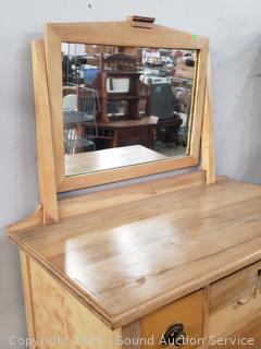 Center drawer had a lock, missing mechanism, no key (difficult to open without a key). Wood casters. A few minor scuffs, dings, mirror vertical supports look to be displaced from original place. 47.5" H x 33" W x 18" D with 20.5" H x 26" mirrored topper.