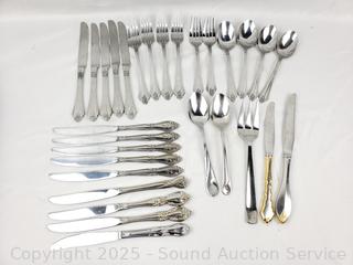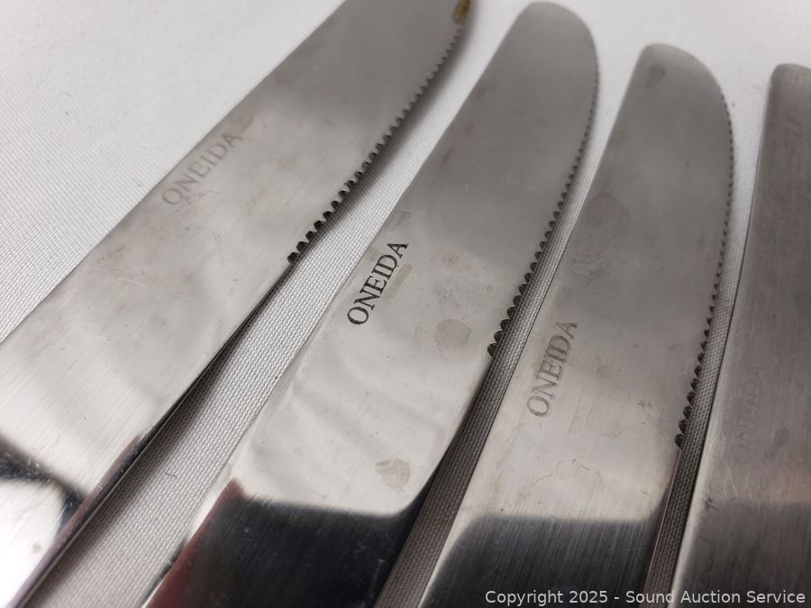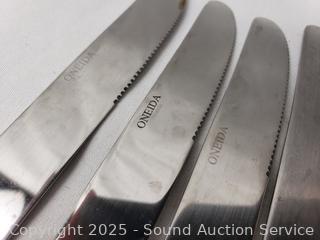 Oneida 5 butter knives, 2 small forks, 4 large forks, 4 large spoons, other knives, spoons, forks.