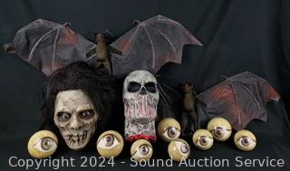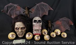 Lot #0092: 2 Zombie Heads, 2 Hanging Bats & Eyeballs Halloween Decor